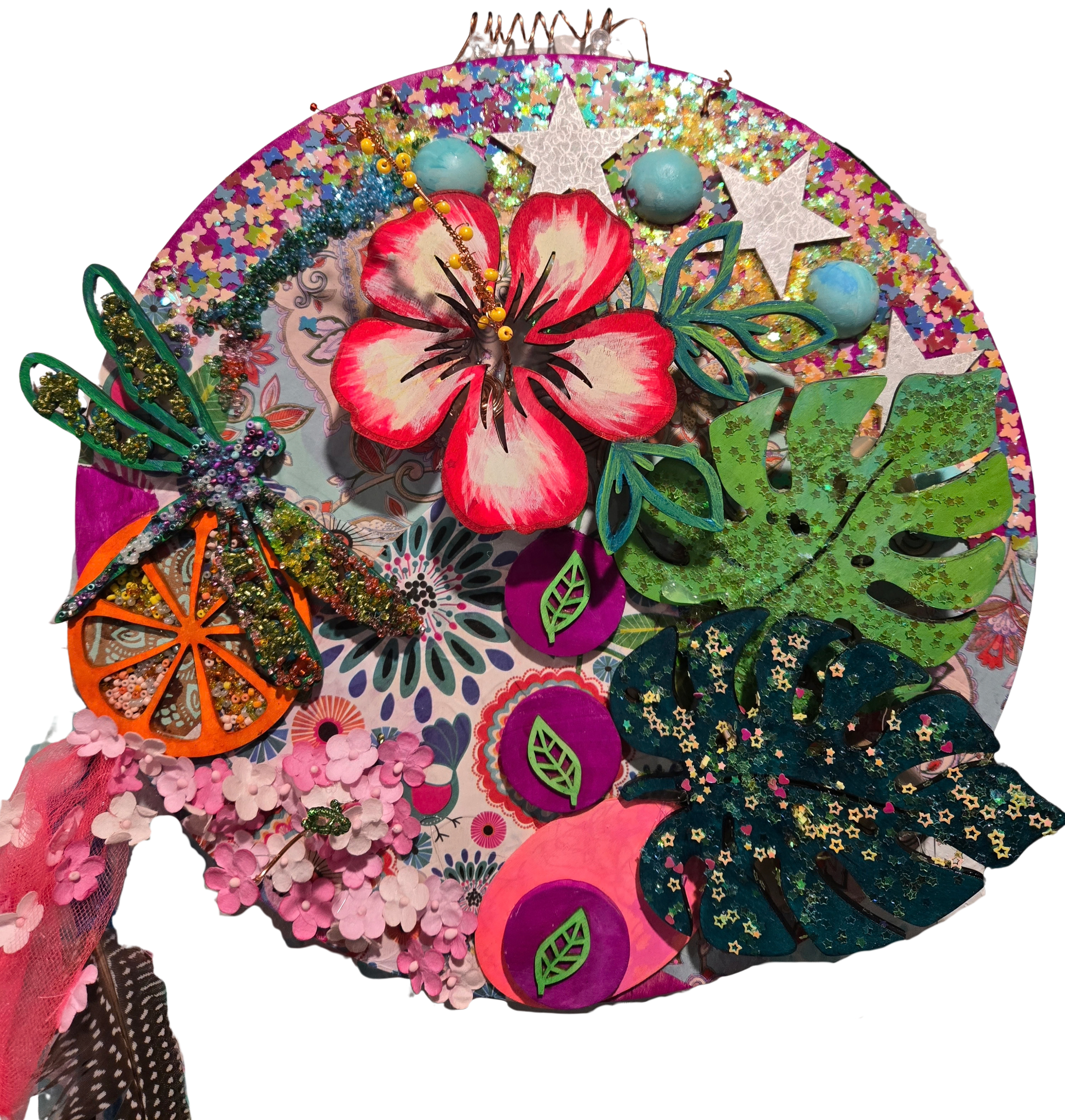 Medium: Mixed medium on board (acrylic paints, beads, wood, glitter, yarn, fabrics, etc)